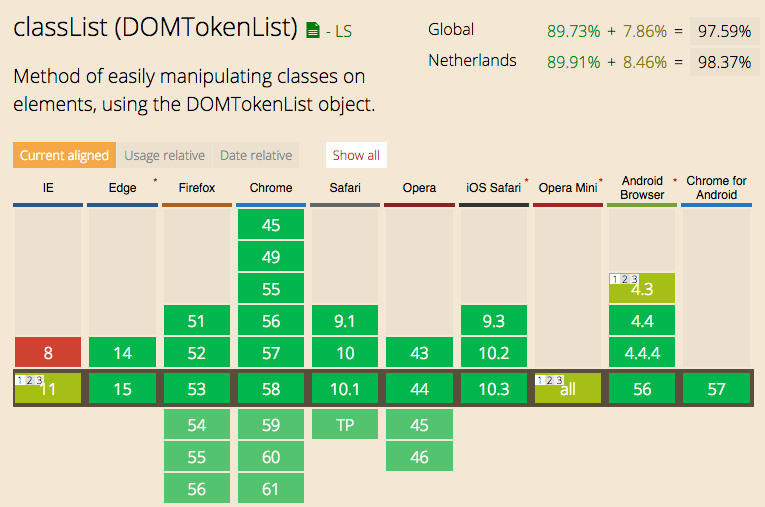 This little script (692B minified, 356B gzipped) is supported in all browsers that support Element.classList which is basically every browser. caniuse.com/#feat=classlist