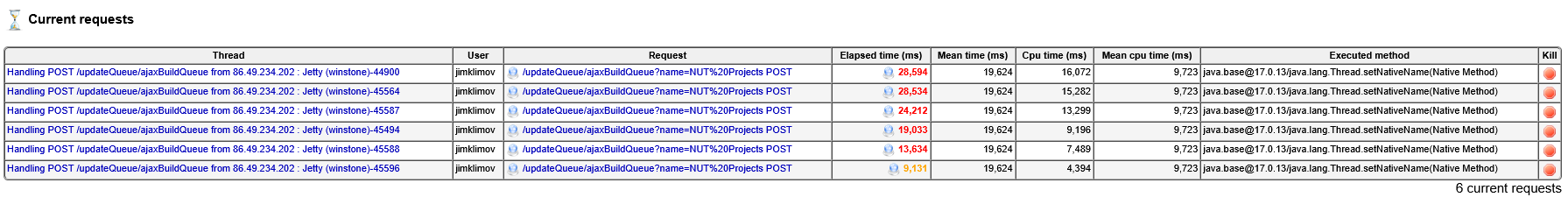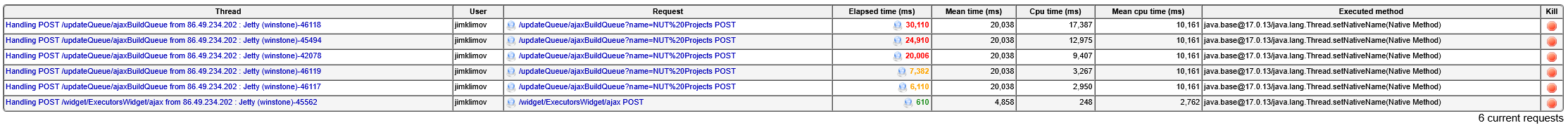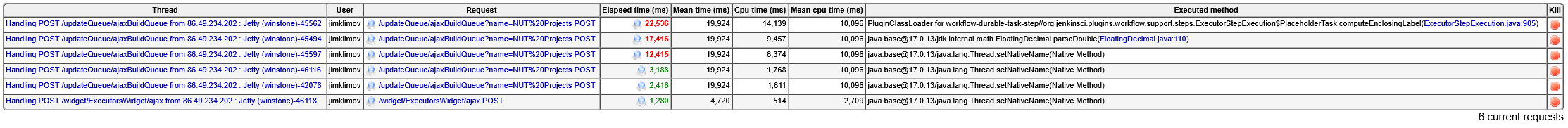 Now, the likely root cause seems the controller's OS taking a lot of time (not usual, reason unknown) to assign thread names. This apparently is not a frequent occurrence in pipeline job processing (maybe because the threads are long-lived, so their name was assigned some time ago), but it did pop up this time with HTTP query handling from the AJAX build queue auto-updates - these are apparently posted by the Web-UI from browser every 5 seconds, and with the work to produce the response (due to both thread name setting delay in kernel, and subsequent work in Java to process the query when hundreds of queue items are outstanding) exceeding that frequency, things pile up quickly.