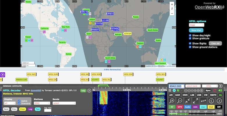 Aircraft to ground station (green) data exchange system. Includes message decoding and aircraft positions (blue) on a map.