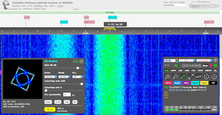 IQ display showing the QPSK modulation of VLF station NLM4 North Dakota (25.2 kHz) as received in Kansas.