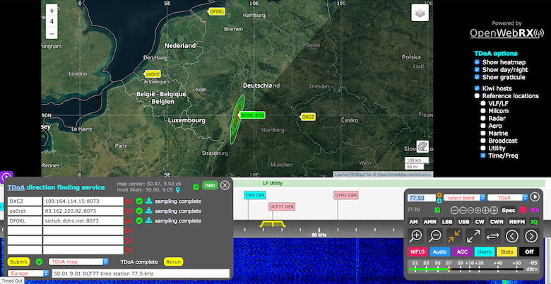 Multiple Kiwis, assisted by their built-in GPS for accurate timing, can cooperate to approximately locate signals. LF time station DCF77 77.5 kHz in Germany accurately located.