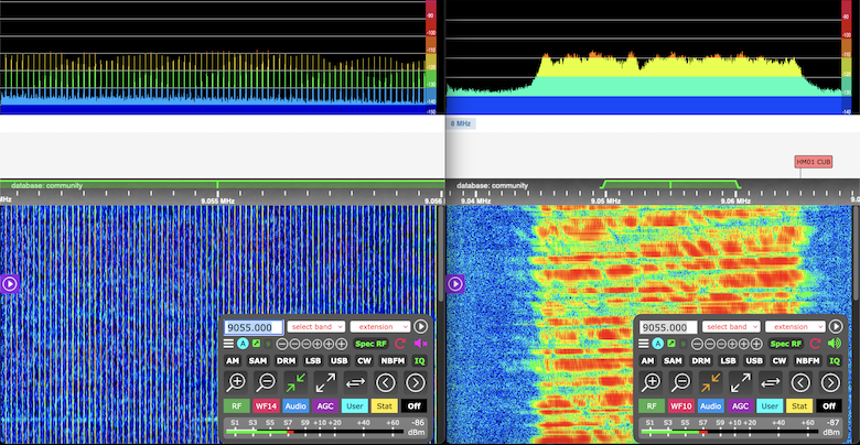 Here is z14 (2 kHz span) on the left showing the 25 Hz sweep rate of an Over the Horizon Radar (OTHR) which is very helpful with signal identification. On the right is z10 showing the full passband.