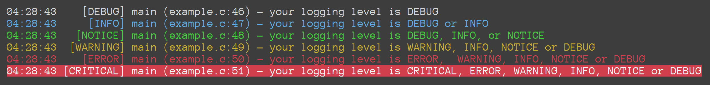 =1). To turn something off, change it to0. Do not remove the macro. The built-in flags are:DISPLAY_COLOUR— enable colour-coding the log messages based on levelDISPLAY_TIME— output the time for each log event (date should be configurable)DISPLAY_LEVEL— display the logging level of each messageDISPLAY_FUNC— display the calling function for each log messageDISPLAY_FILE— print the file from which the log message originates fromDISPLAY_LINE— print the line from which the log message originates fromDISPLAY_BORDER— print the border that comes before the messagesDISPLAY_MESSAGE— print the log messageDISPLAY_ENDING— print the message ending (by default it's\n)DISPLAY_RESET— reset the message colour-coding at the end of each log