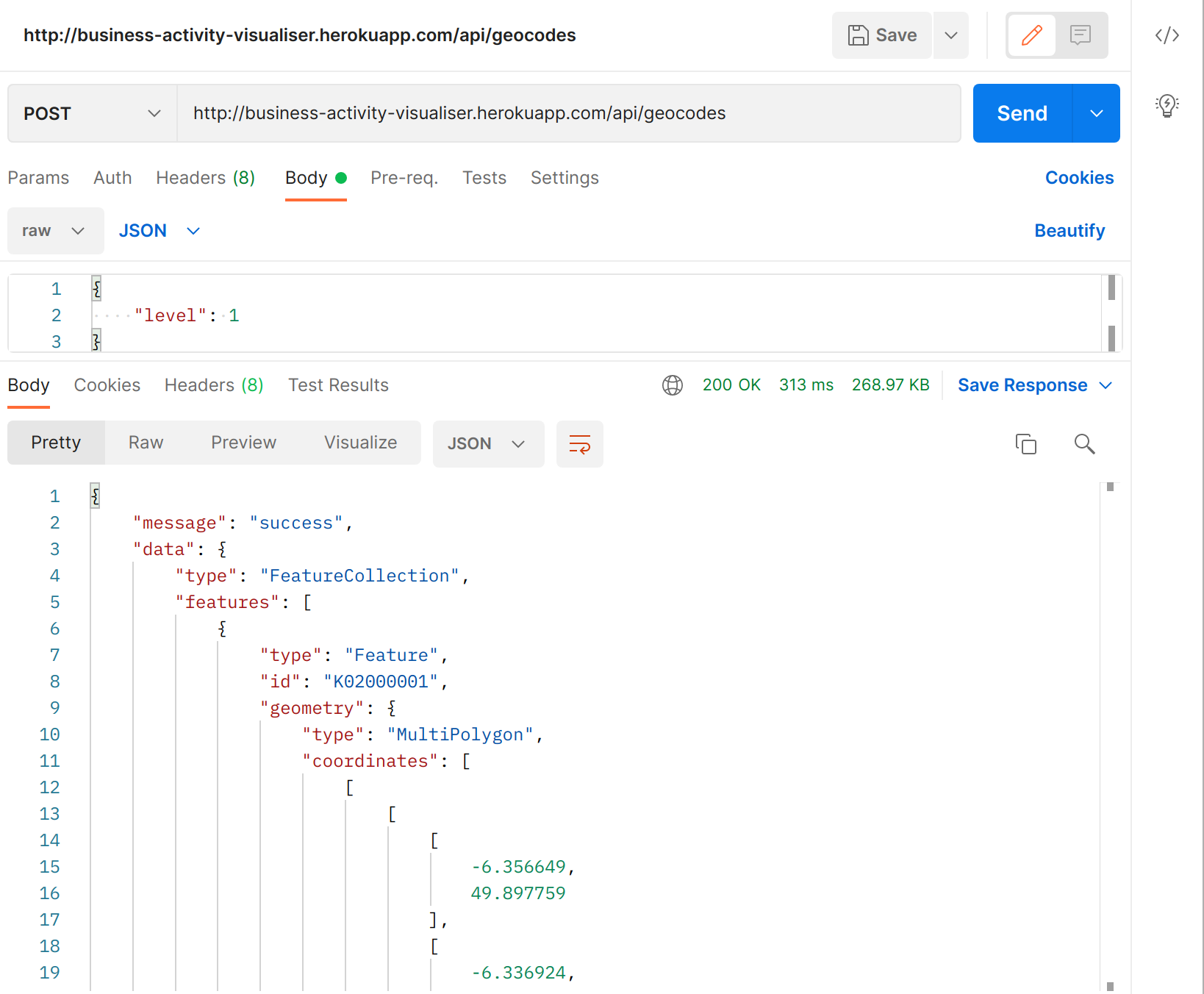 message: "success"data: a geoJSONFeatureCollectionof each geographical entity at that level, for each feature thepropertiesattribute has keys of industry group from table 1 and the value is the summation for that geographical area