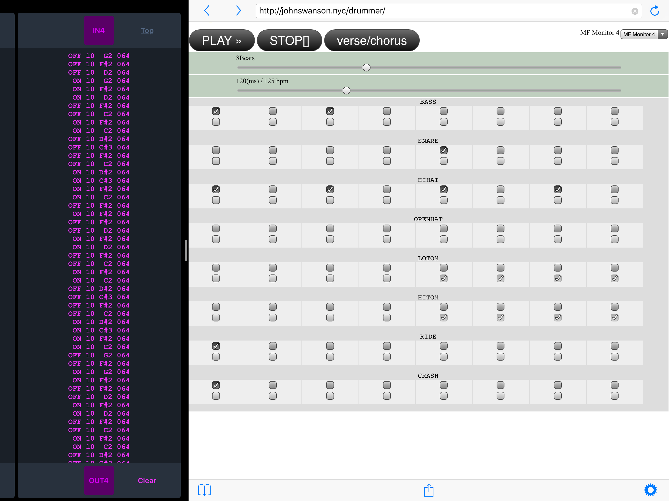 Use the MFmonitor app as the output destination of the drum_brain webpage loaded in the Webmidi Browser,