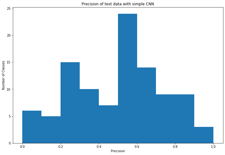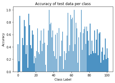 The average test accuracy was 47% and the average over all class specific accuracies was 44%.The