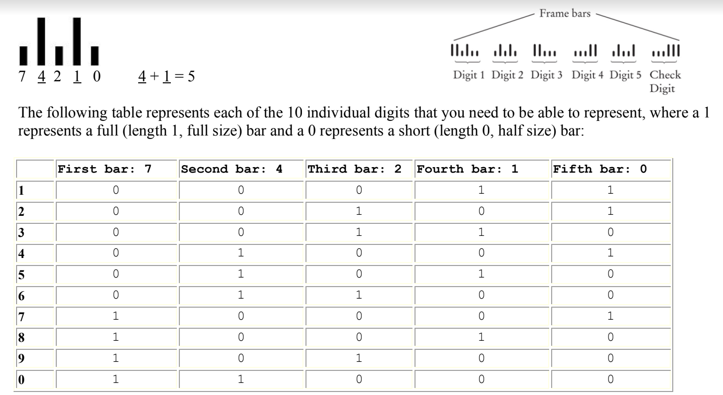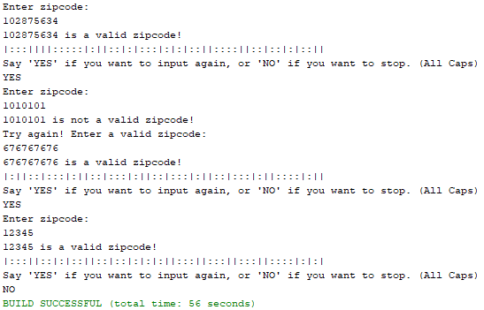 This is an assignment for CSC 135 that I wrote code for. It asks for a ZIP Code input of 5 or 9, then creates a barcode format with ':' as short and '|' as long based on the old version of USPS Barcode formatting.