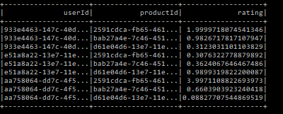 - Now you can launch Spark, which should be preferably scheduled to run every a defined period of time, this will insert recommendations of products for users using the ALS algorithm. the higher the value of the rating is the more likely the use will love the product.