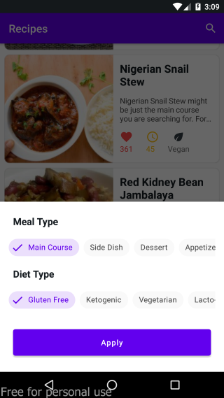 TheFoodRecipes The food recipes use data from spoonacular Api https://spoonacular.com/ This project was originally created by following a Udemy course. Main page Food Details page Filter bottom sheet
