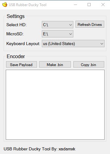 This tool was made for Hak's USB Rubber Ducky. It helps users create, and copy Rubber Ducky payloads to their Ducky's MicroSD card. The tool will automatically make a home directory (ie C:\RubberDucky) and download the most up-to-date encoder.jar file from the Rubber Ducky Wiki. (Currently uses encoder v 2.6.x)- Select HD: Which drive the home directory for the ducky will be made.