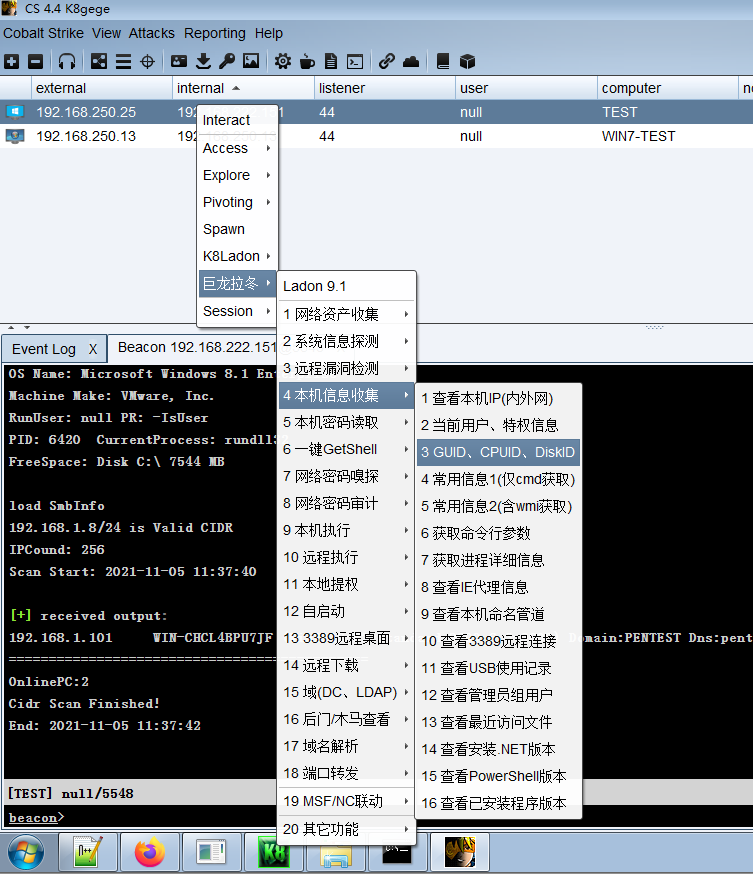 如果你熟悉Ladon命令的可以直接在Beacon上执行相应命令即可,如使用“Ladon GetID”命令查看目标机器名、机器ID、CPUID、硬盘ID、MAC地址等信息,主要用于区分一些大内网同名机器,或其它用途。若是你不熟悉可以使用右键菜单,为了方便新人或不太熟的人