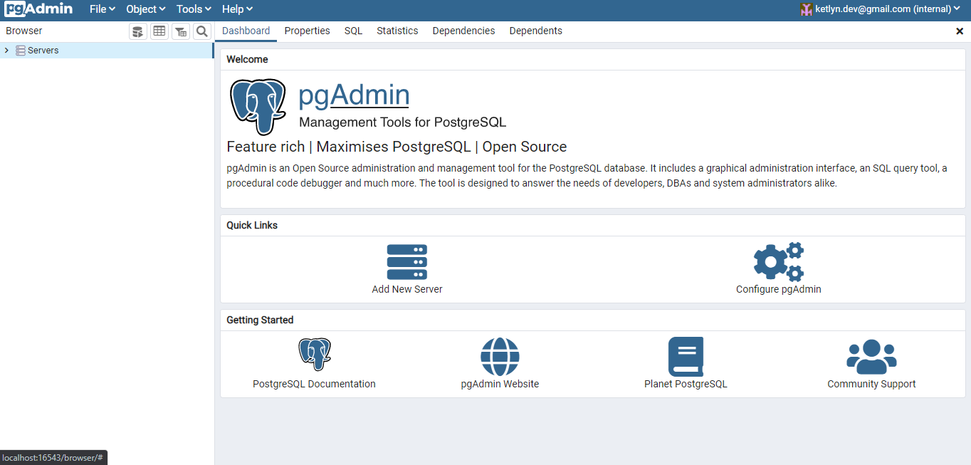 PgAdmin2019!Fornecendo as credenciais de acesso que estavam no arquivo docker-compose.yml aparecerá então o painel de gerenciamento do pgAdmin 4: