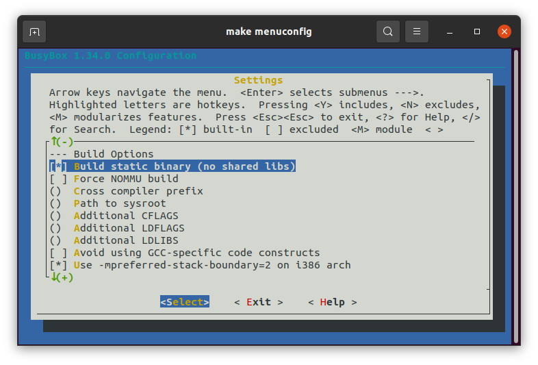 $ make -j4busybox is an executable file - /bin/busybox that contains a set of standard tools like coreutils. In the busybox menu we need to enable: Build BusyBox as a static binary (no shared libs) option: