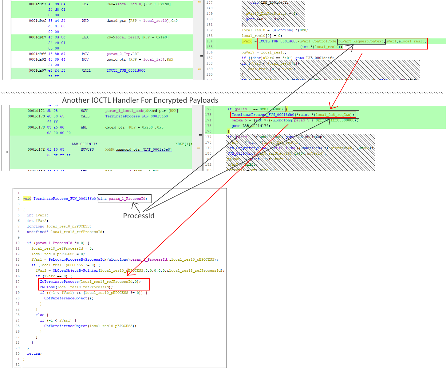 It eventually calls ZwTerminateProcess in the vulnerable driver context (ring-0).