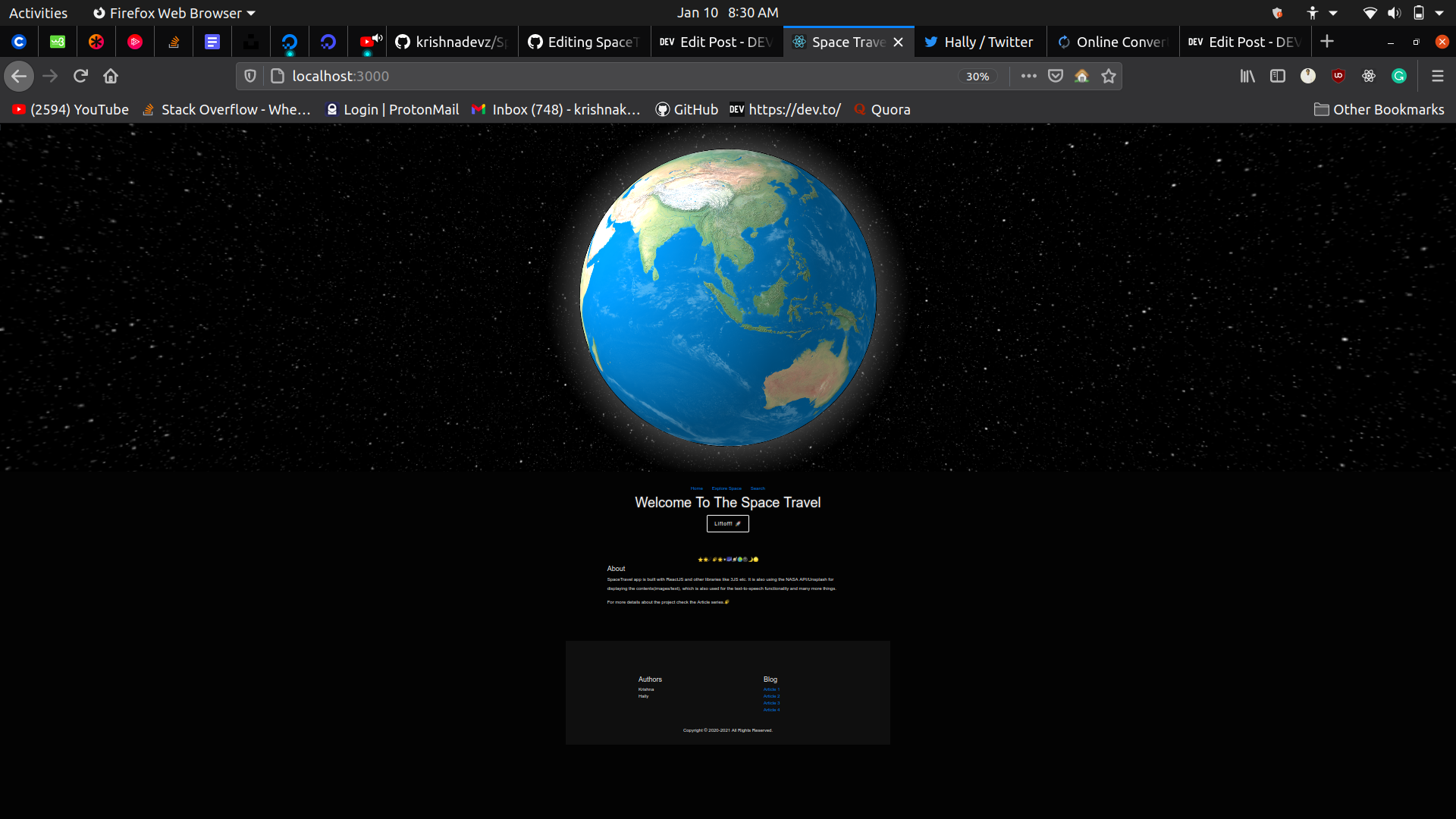 First Component of this project and is 3d earth and also it is built with help of reactjs and threejs liraries and also there is one footer component below and for routing pages we used