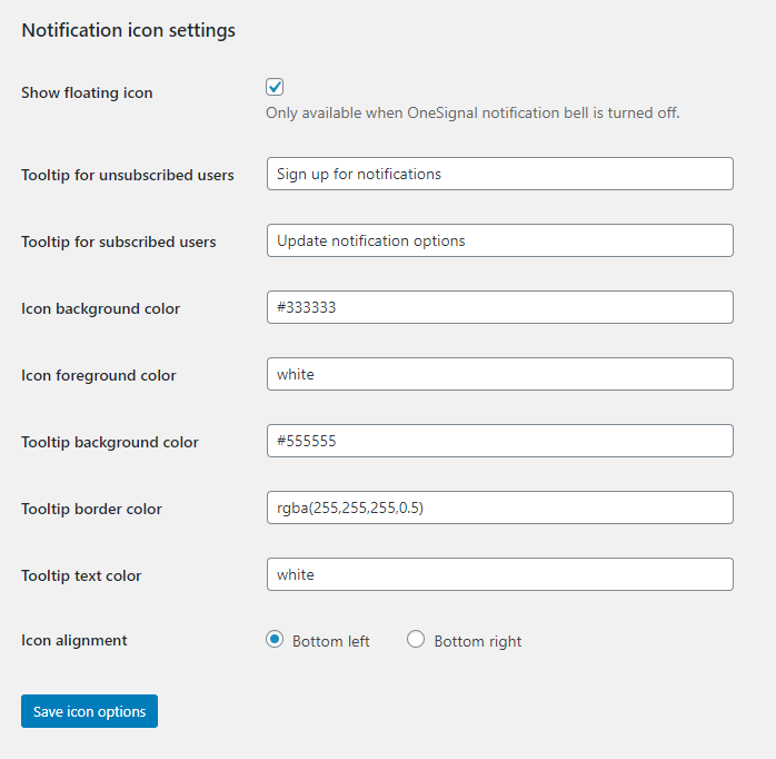 This setting enables a floating notification bell. It is similar to the feature in the OneSignal WordPress plugin, but launches a popup to allow users to select categories before triggering the native browser notification permission prompt.