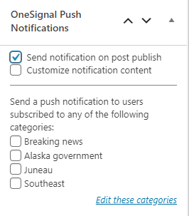 Push Notification User Tags extends the OneSignal plugin to add an interface for site visitors to choose their notification categories and an admin interface to choose which categories should receive push notifications for any given post publish/update.