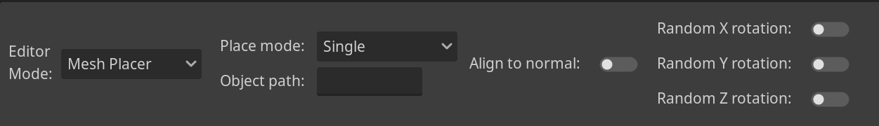 Mesh Placer- Select anyNode3Dtype-derived object in Scene tab. This will be the parent for added scenes by this mode. InObject pathcopy path to the scene you need to spawn. In this mode you cannot select any objects in the viewport while an object inSceneis already selected.