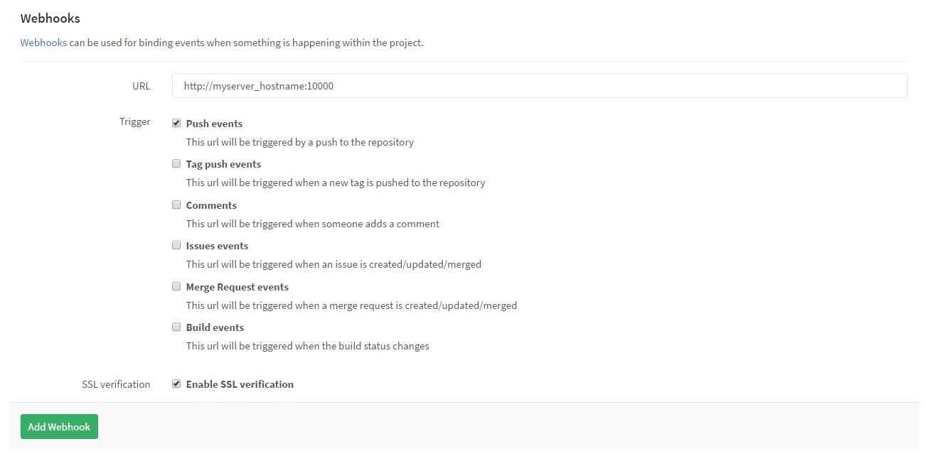 }You can edit this file to match with your needs, as all the options that GWS supports are provided via this file. Once the file is edited to meet your requirements simply run npm start to launch the server. It'll show URL and port number that server is running on (eg; GitLab CE Webhook Server started on http://yourhostname:10000 at <timestamp>), you can than go to repository settings in your GitLab, then in Webhooks section, you can add this URL and select events that you want to invoke it for and click on "Add Webhook", like below.