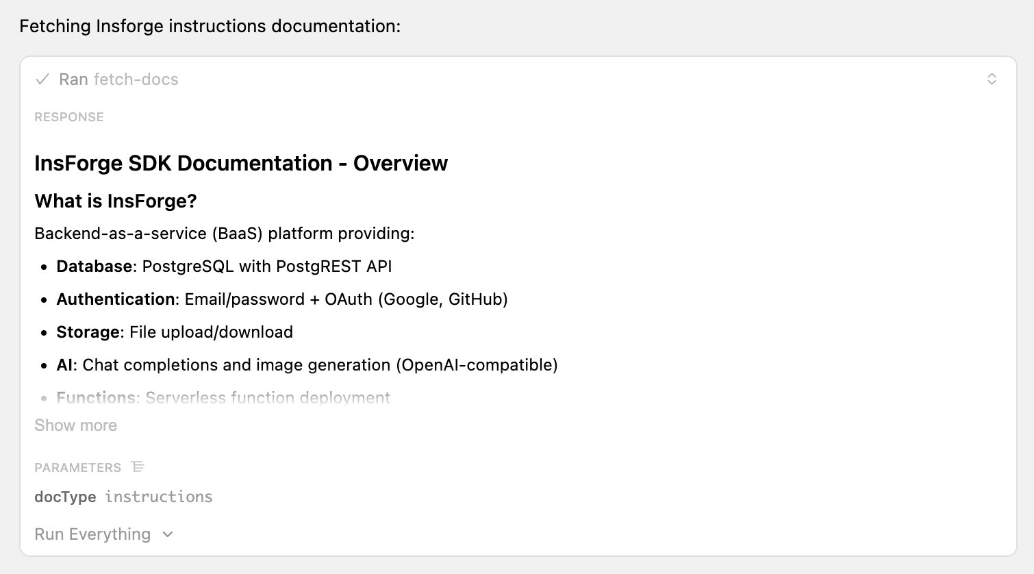 Sample successful response calling insforge MCP tools