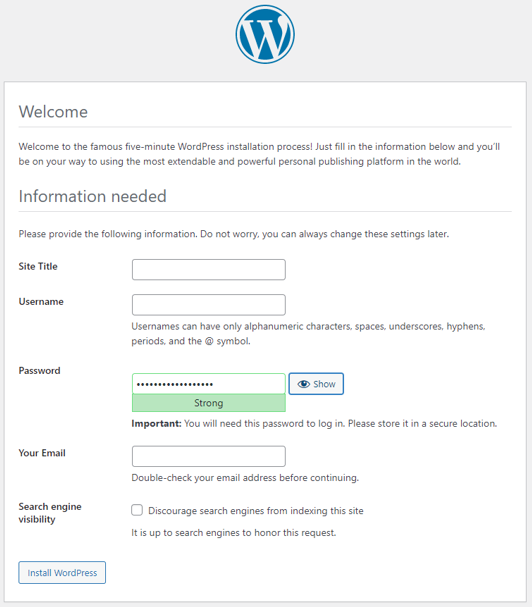 Fill up the labels with your information and you have yourself a fully configured Wordpress. Now you can customize your new Wordpress administration dashboard as you like.
