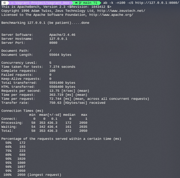 The following command was used to test the server ab -k -n100 -c5 http://127.0.0.1:8000/