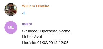 Para sabermos o status da linha azul do metro, rodamos o comando /1.