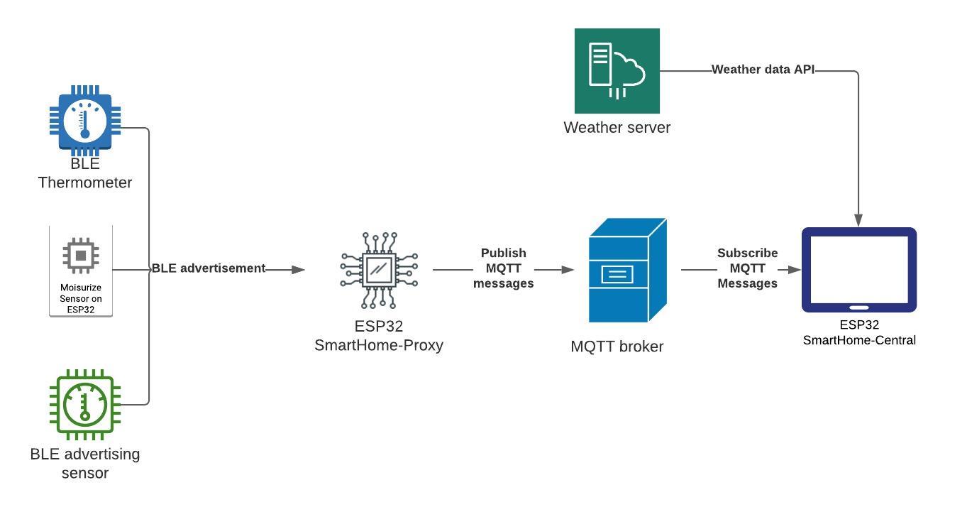 I could not do with just one ESP32 device (and avoid proxy and MQTT) I could not achieve BLE + HTTP + LVGL in one ESP32 generic device (no PSRAM chip). LVGL does not play nice together with BLE so I came up with idea to split into two devices- Proxy and Central.