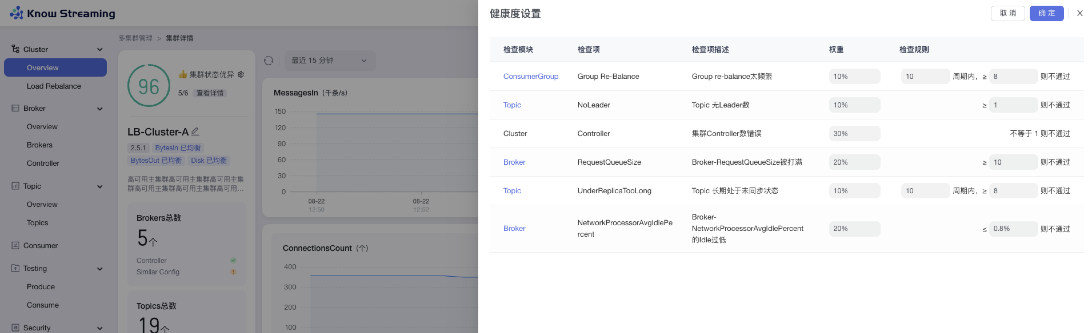 步骤 2:指标筛选抽屉展示信息为以下几类“Health”、“Cluster”、“Broker”、“Consumer”、“Security”、“Job”