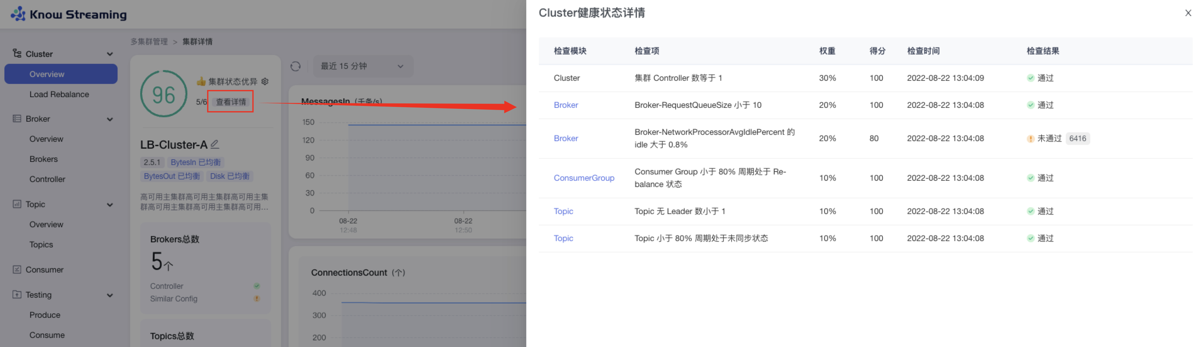 步骤 1:点击“多集群管理”>“集群卡片”>“Topic”>“Overview”>“集群健康状态旁边【查看详情】”>“健康检查详情抽屉”