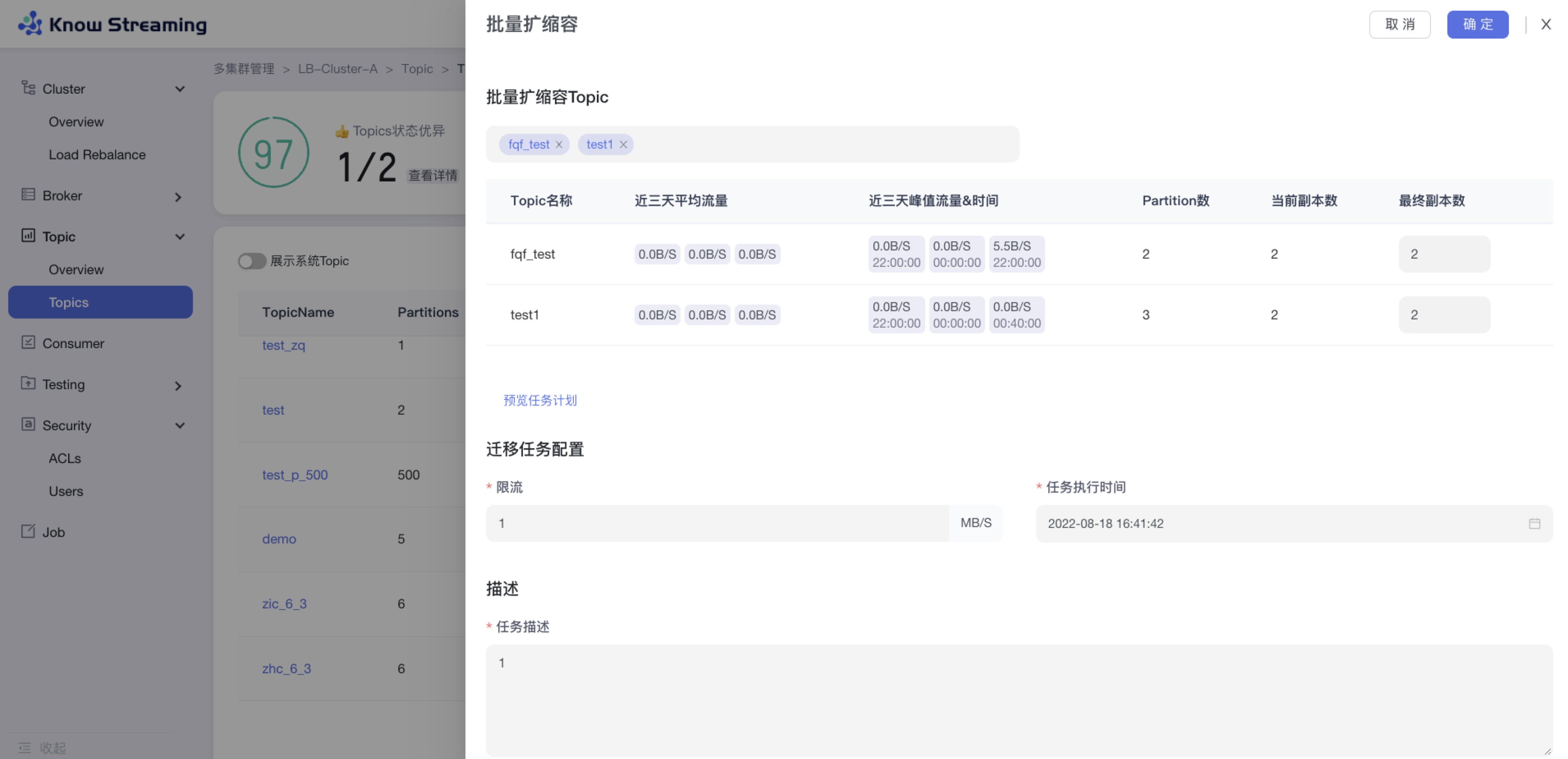 - topic 扩缩副本:可以对最终副本数、限流值、任务执行时间、描述等参数重新配置