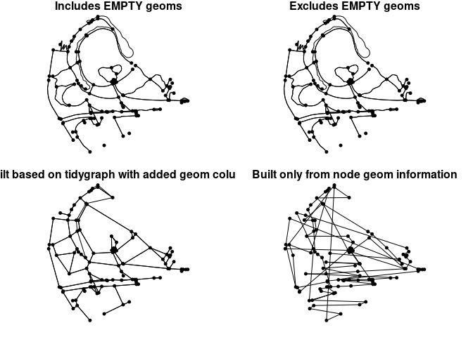 g_sf |> tidygraph::convert(to_spatial_explicit)we are basically creating straight lines between the nodes coordinates, losing the original topology stored in the edges.So instead of building the sfnetwork from the nodes as Josiah did, I tried to build it from the edges but got into problems. In escence, the geometry column has empty rows, and sf does not support this (see r-spatial/sf#1034).