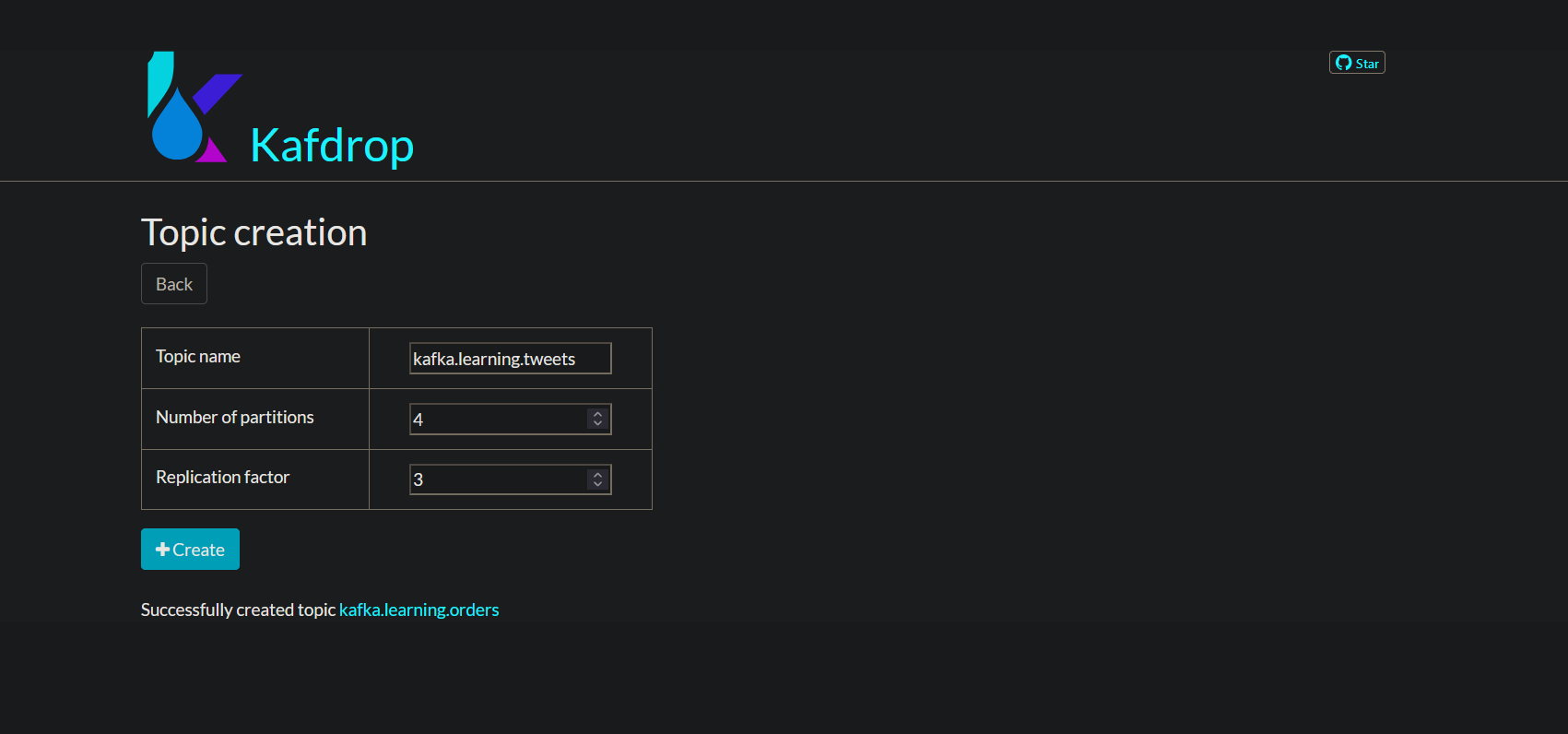 - "kafka.learning.orders" topic creation with 3 partitions and 2 replicas