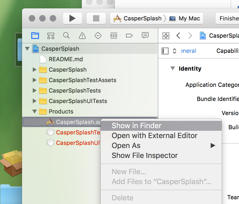 - Once you have built the app lets go ahead and find it and move it a new CasperSplash folder for our project. Expand the Splash Buddy project file and check in the 'Products" folder for your new app > Right click > Open in finder > Copy to a new folder.