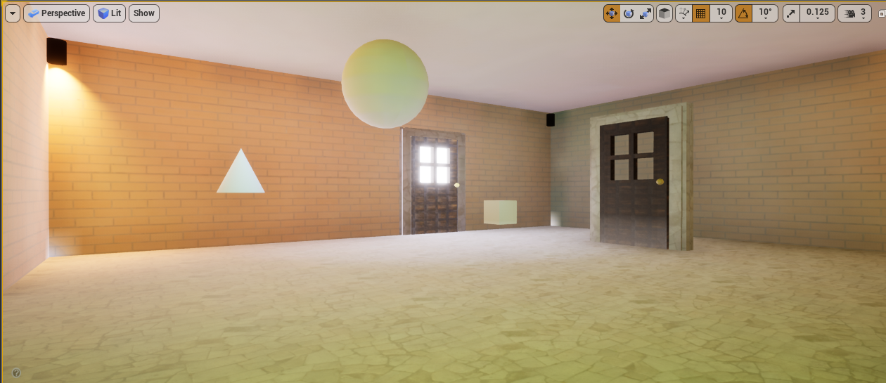 This is the level I created using box brushes for the walls, floors and ceiling, a subtractive box brush to make a whole in the wall to place the exit door, door, cube and cone meshes as objects and surfance materials and textures downloaded from texture.com and modified on Gimp to .jpg format and then Uasset to be read by Unreal Engine.d