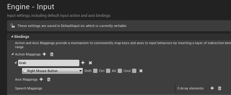 - Then it needs to be called in the code passing the parameters for the input event (button to be pressed), defining which object is calling it and the function that this input will perform - whether grab or realease, from the UGrabber function.