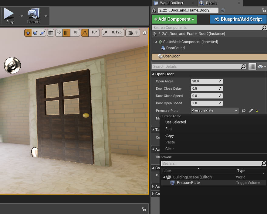 - 4- Created an "OpenDoor" component and attached it to my door meshes in order to make them open when the objects were placed in the pressure plate