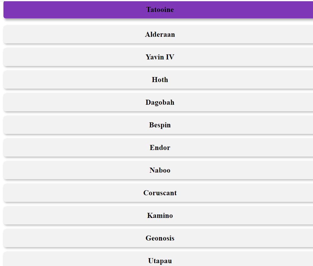 Currently, the application is able to get all of the planets and create list elements to display the planet names.