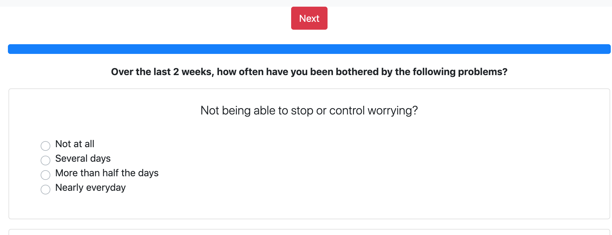 It completes the blue bar and offers to click on next mid way through the second activity (GAD7). People will probably still try to finish the activity, but it's a bit of a bug.