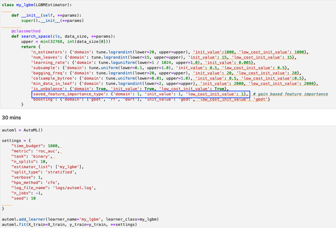as what's shown here: https://lightgbm.readthedocs.io/en/latest/Parameters.html#saved_feature_importance_type, but when calling FLAML's estimator's feature_importance_, it's still using split counts....Any suggestion? Thank you!