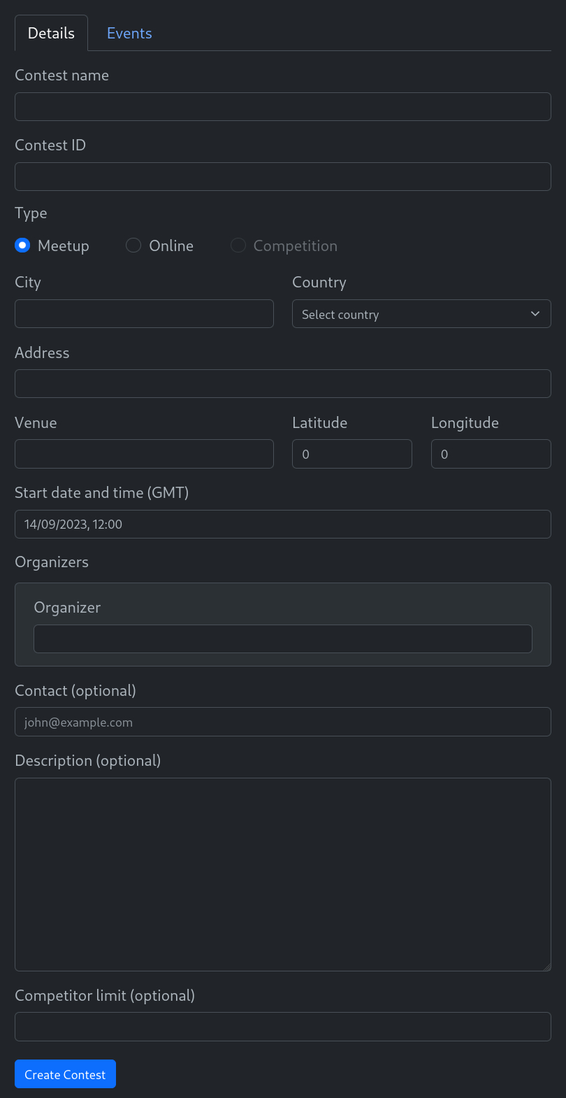 If your DB is empty, the backend will fill the events collection with official WCA events, some unofficial events, including the removed WCA events, some Extreme BLD events, and some miscellaneous events.