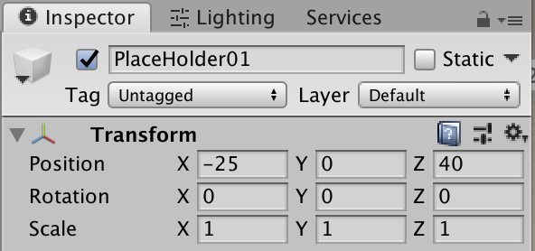 MapTestPlaceHoldersGameObject and select "Create Empty". Repeat this process two more times so that there are three children ofMapTestPlaceHolders(one for each child ofTargetObjects). Rename these GameObjects, "PlaceHolder01", "PlaceHolder02", and "PlaceHolder03", respectively. Use the following values for the Transform component of each object.