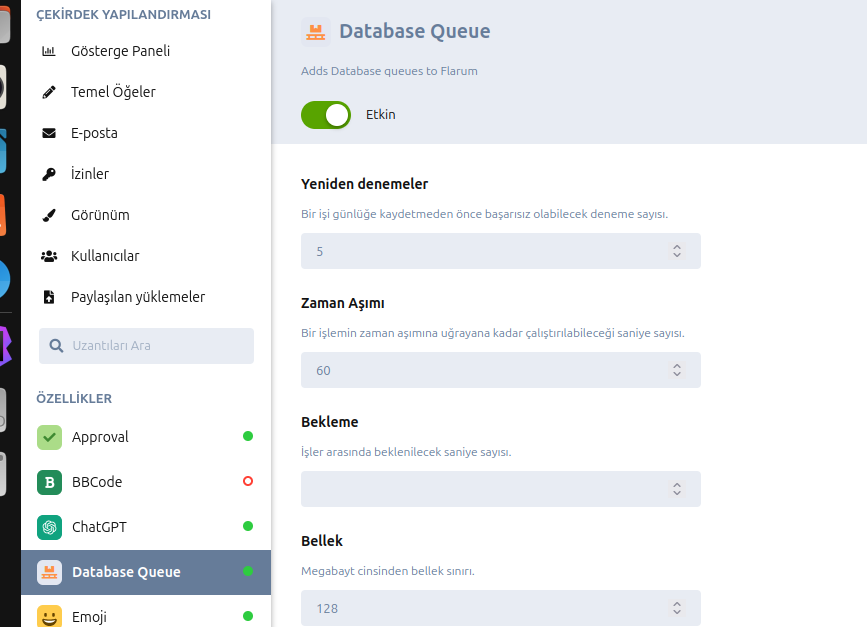 php flarum cache:clearIf you set Answer Duration (Cevap Verme Suresi) value to greater than 0 then, set the database queue extension retry count (Yeniden denemeler) to 5 or greater.