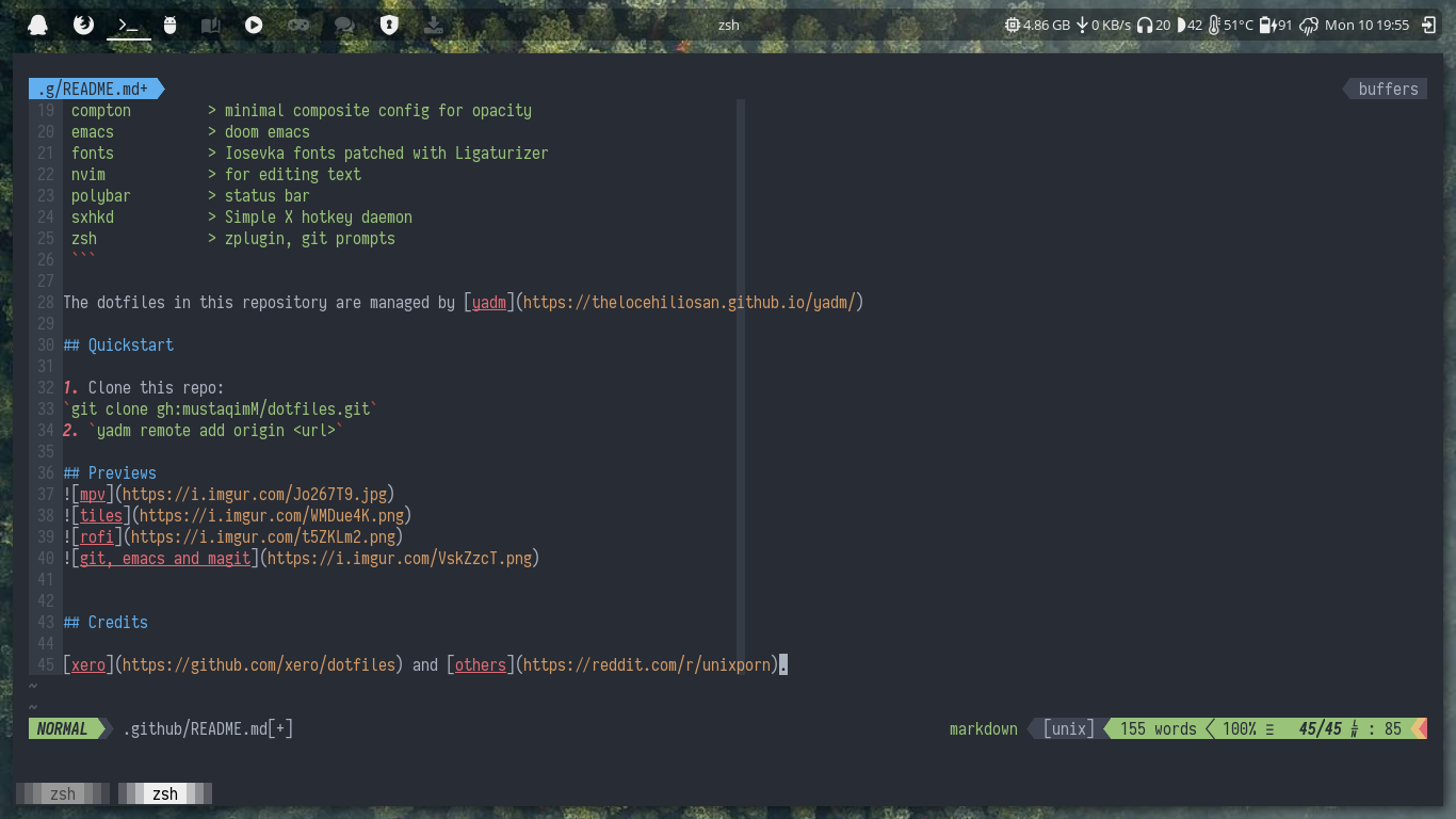 git clone gh:mustaqimM/dotfiles.git yadm remote add origin <url>