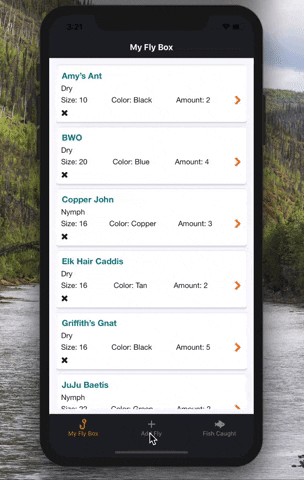 MyFlyBox is a modern way for Colorado fly fishers to organize and keep track of their flies. A user can input a new fly into their box, make edits, or remove the fly entirely. Additionally, the user can either take or upload an image of a fish they've caught, add in information regarding the fish (including species, length, weight, location caught, and fly used) and save it to their MyFlyBox app as a convenient way to look back on the fish they've caught. If the user is unsure of the species, MyFlyBox will use the image provided to identify the species for them.