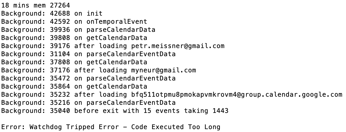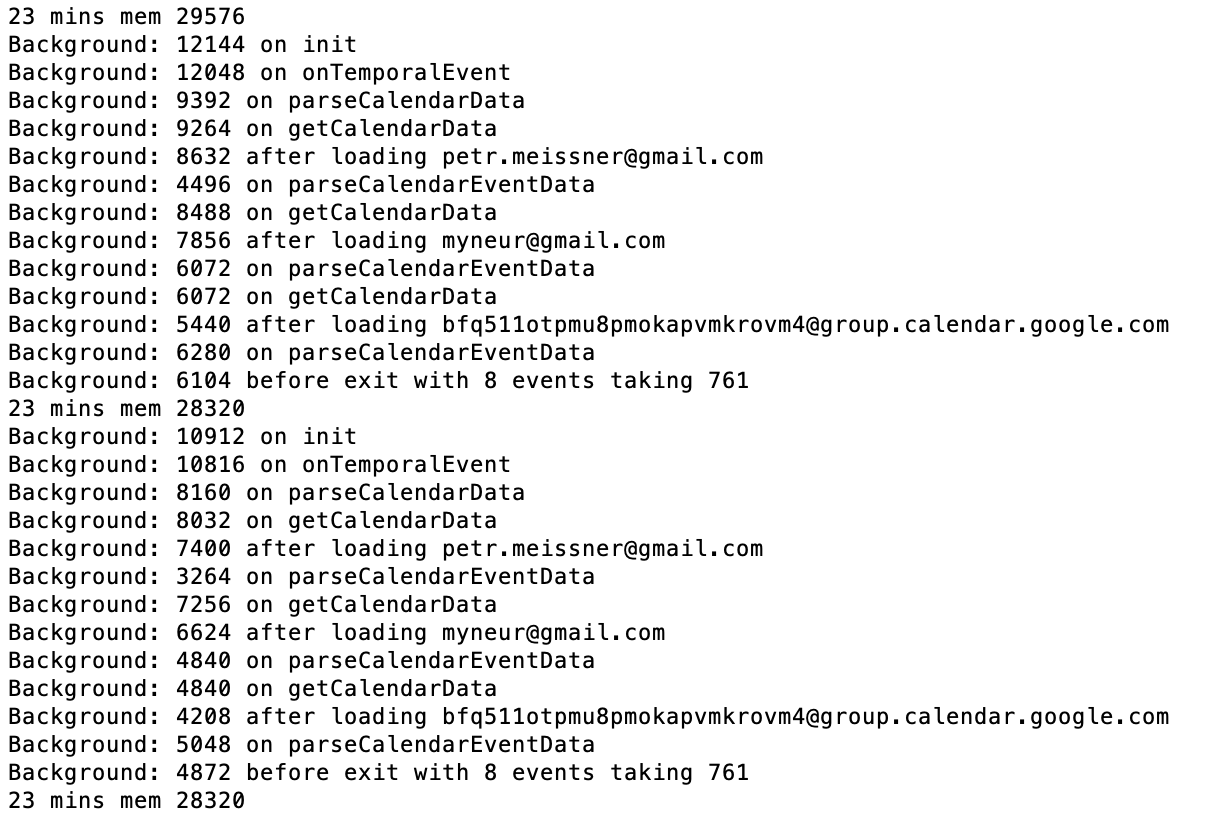 Background data is limited. Now it reliably loads just first 7 events from 8 events per calendar. The per calendar limit is tougher because the response json has lots of the data.