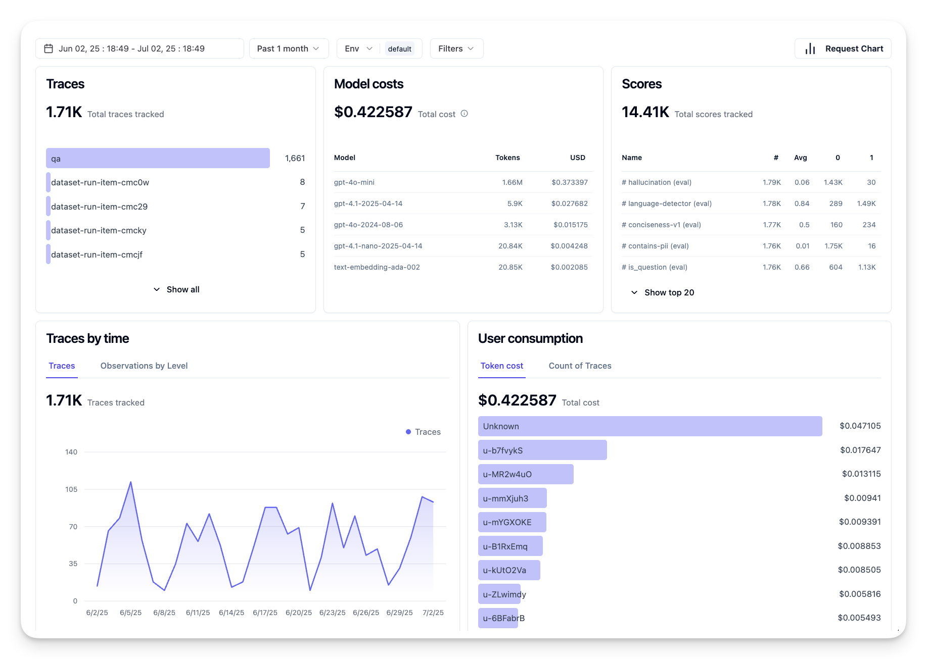 Accuracy: How frequently does the agent produce correct or desirable outputs? Accuracy definitions vary (e.g., problem-solving correctness, information retrieval accuracy, user satisfaction). The first step is to define what success looks like for your agent. You can track accuracy via automated checks, evaluation scores, or task completion labels. For example, marking traces as "succeeded" or "failed".