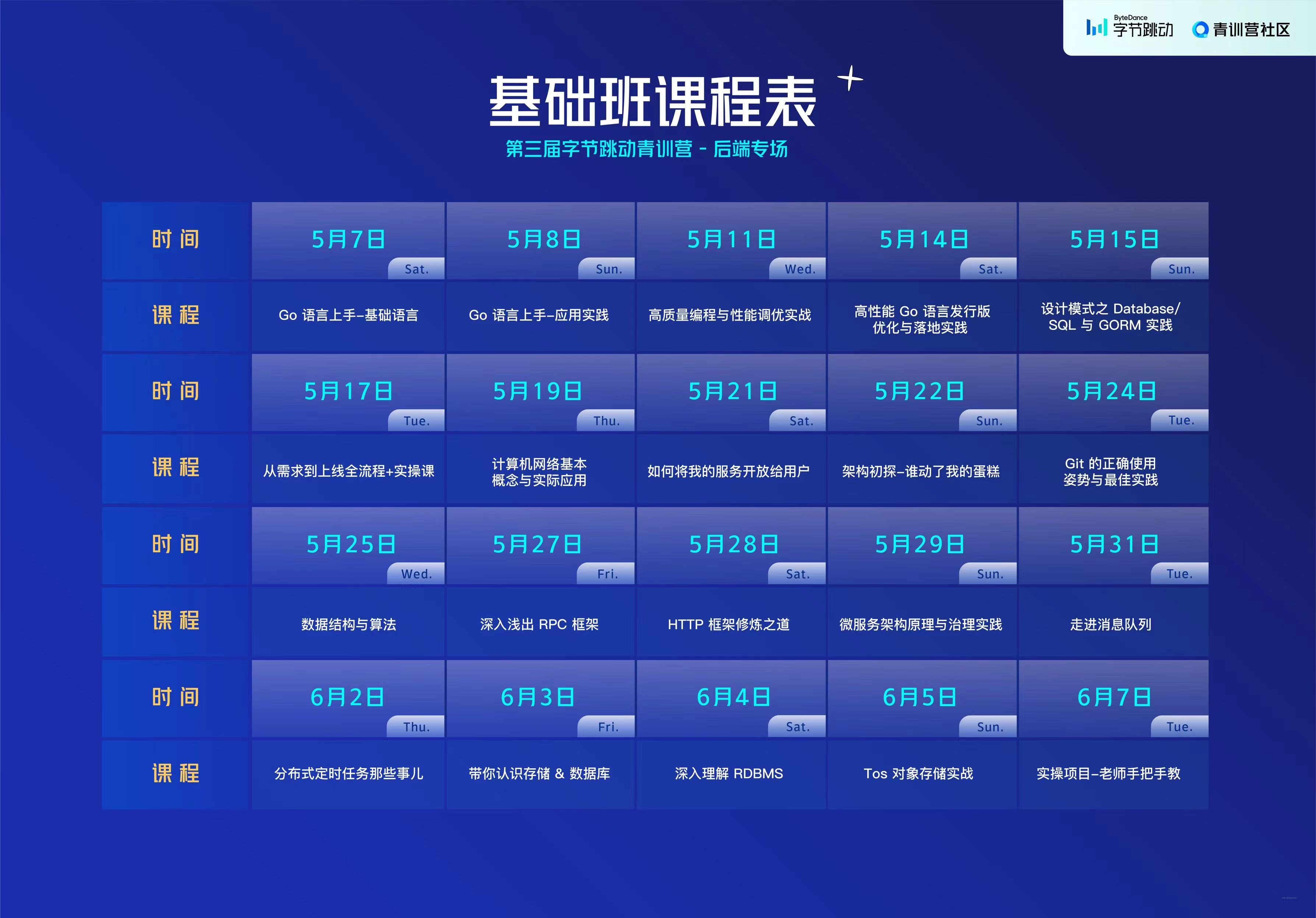 **《字节跳动青训营》**是面向在校大学生开放免费社区的,有前端、后端专场。基础班和进阶班需要笔试(计算机基础知识+2道编程)过了即可。