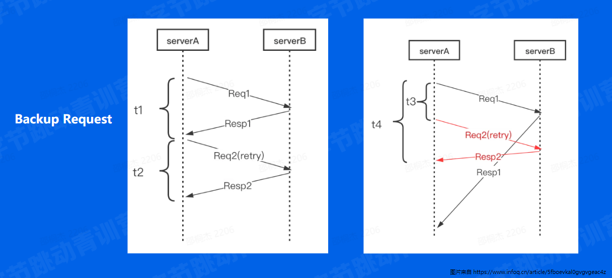 我们预先设定一个阈值 t3(比超时时间小,通常建议是 RPC 请求延时的 pct99 ),当 Req1 发出去后超过 t3 时间都没有返回,那我们直接发起重试请求 Req2 ,这样相当于同时有两个请求运行。然后等待请求返回,只要 Resp1 或者 Resp2 任意一个返回成功的结果,就可以立即结束这次请求,这样整体的耗时就是 t4 ,它表示从第一个请求发出到第一个成功结果返回之间的时间,相比于等待超时后再发出请求,这种机制能大大减少整体延时。