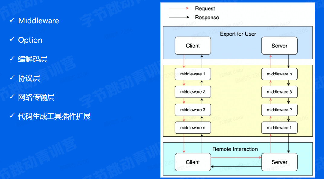 一次请求发起首先会经过治理层面,治理相关的逻辑被封装在middleware中,这些middleware会被构造成一个有序调用链逐个执行,比如服务发现、路由、负载均衡、超时控制等,mw执行后就会进入到remote 模块,完成与远端的通信